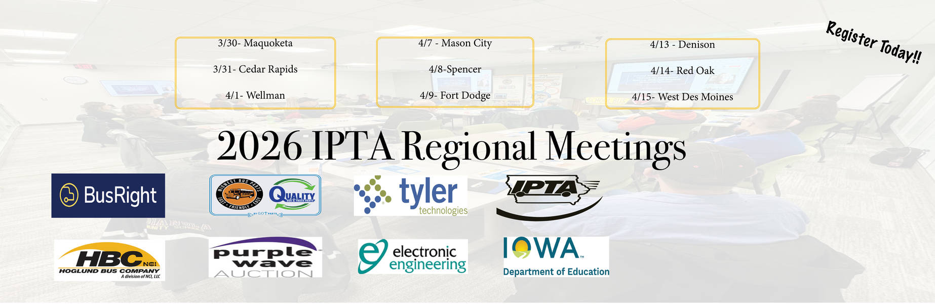 The 2026 Annual IPTA School Transportation Summer Conference and Trade Show will be held on July 20-22, 2026 at the Airport Holiday Inn and Conference Center, 611 Fleur Drive, Des Moines, Iowa.